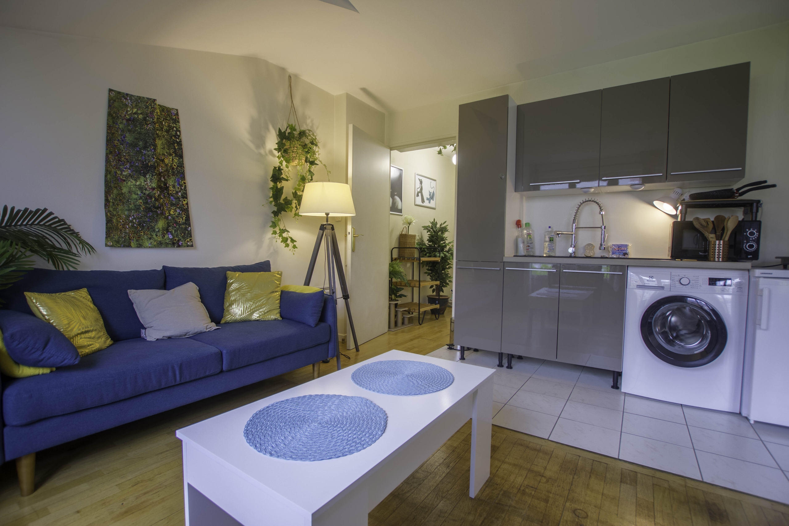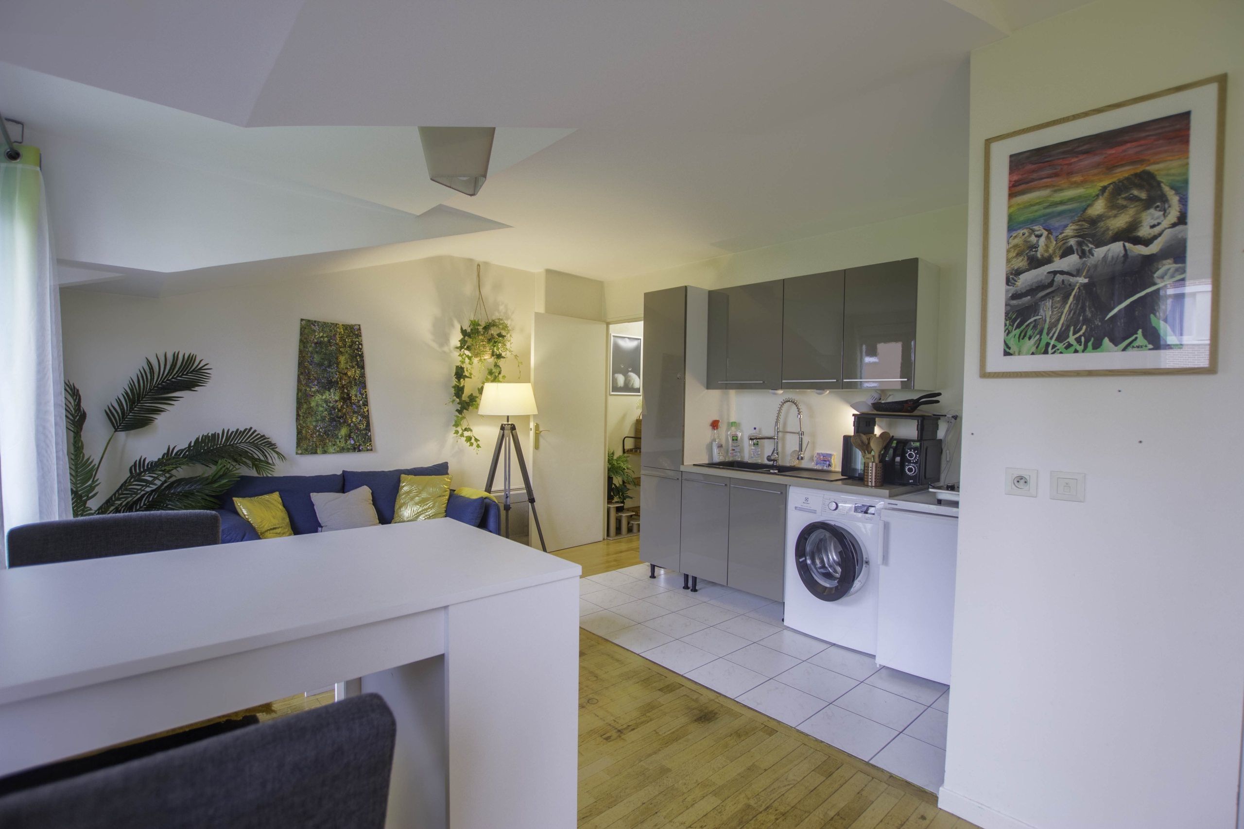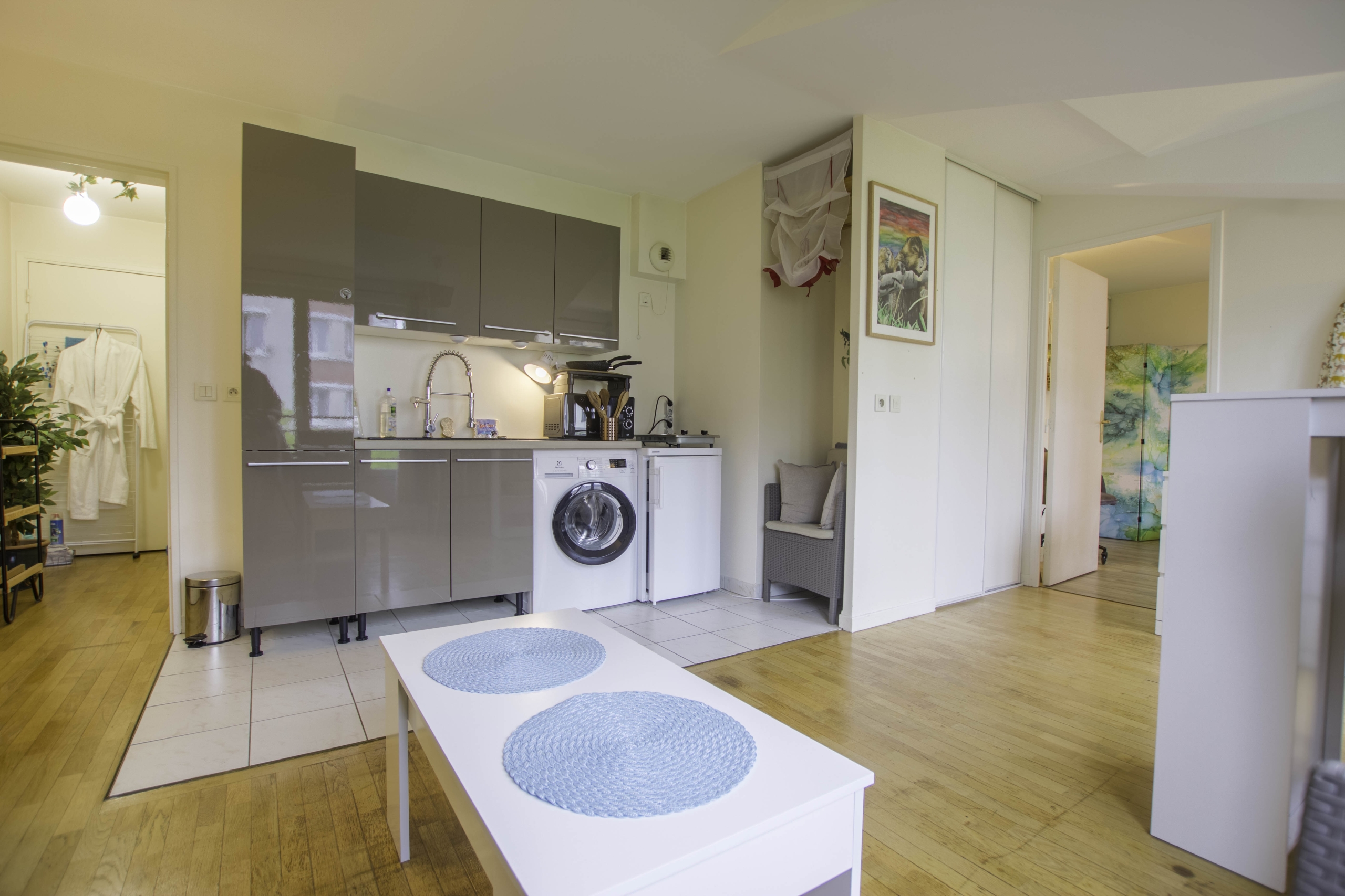 Cet appartement vous séduira par ses espaces lumineux et accueillants. La cuisine est entièrement équipée avec plaque de cuisson, frigo, lave-linge et divers ustensiles, vous offrant ainsi tout le confort nécessaire pour préparer de délicieux repas. Le salon, spacieux et lumineux, vous invite à la détente et à la convivialité.