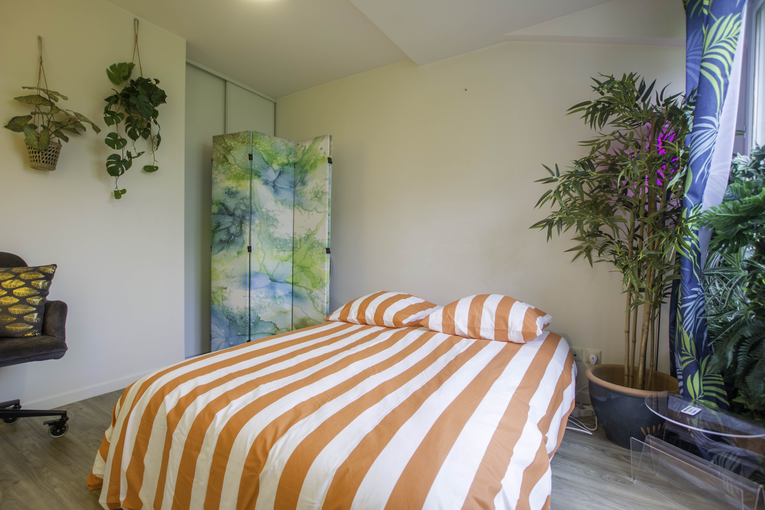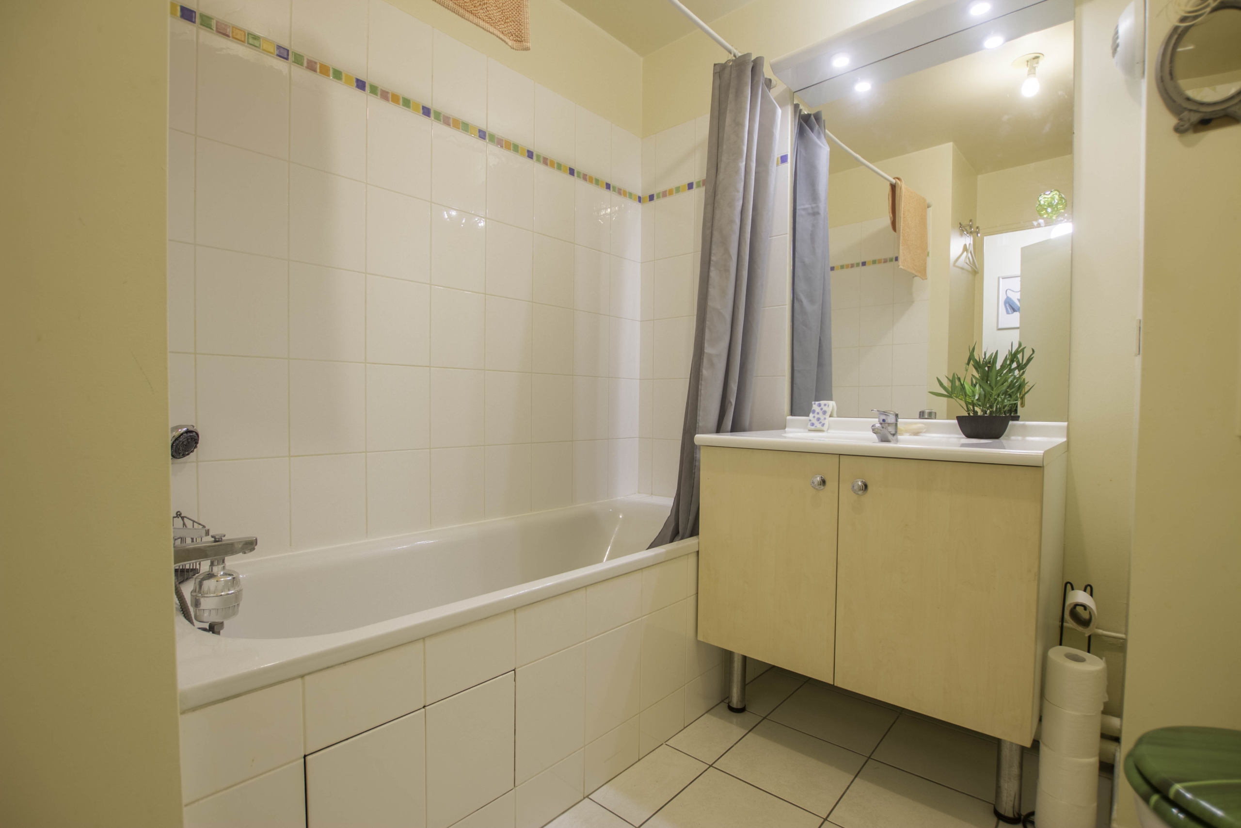 La chambre, avec ses rangements intégrés, offre un espace de repos calme et confortable, tandis que la salle de bains, équipée d’une baignoire et de WC, vous garantit des moments de détente absolue.
