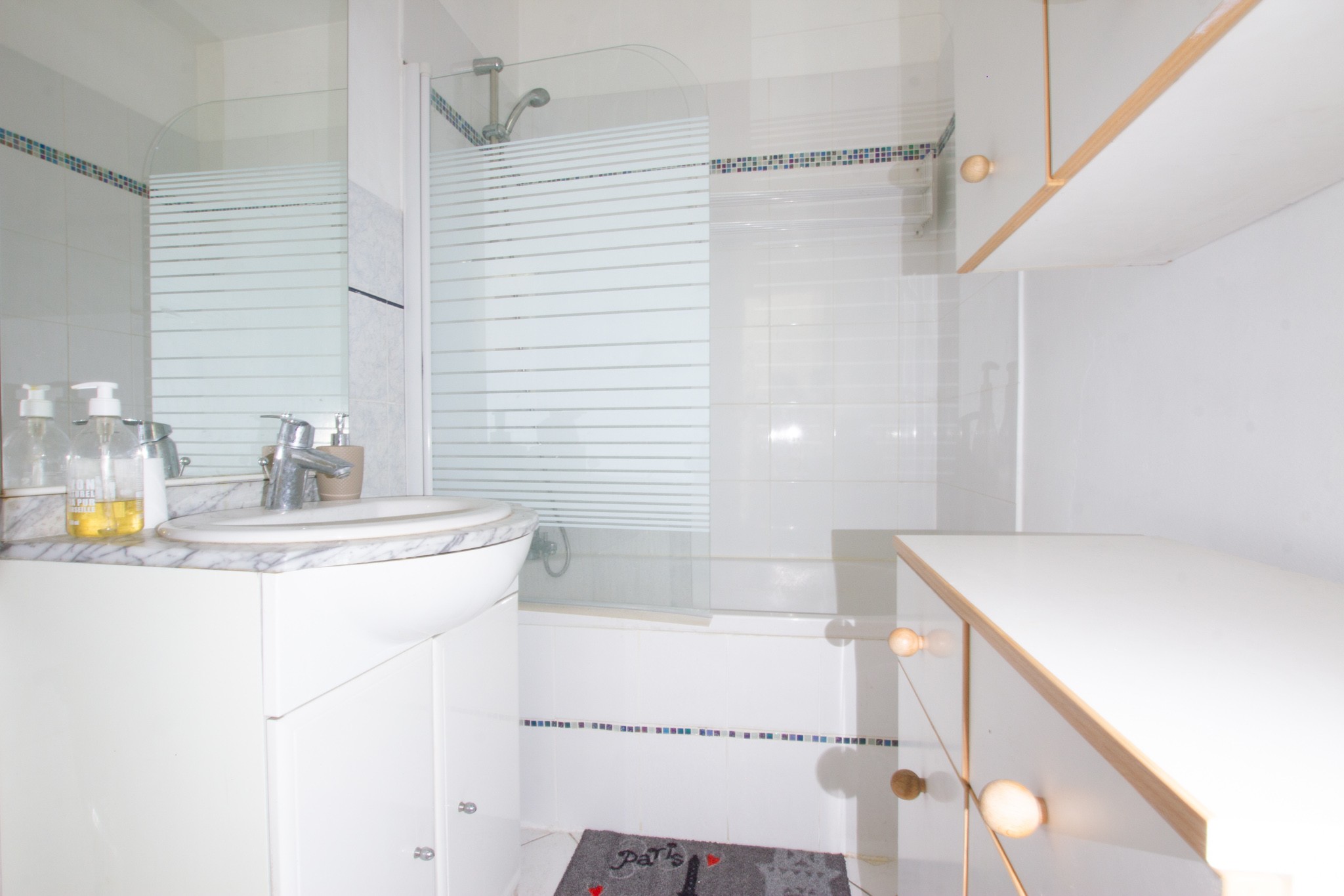 Il se composé d’une entrée avec rangements, d’une salle de bains (baignoire) et d’une vaste pièce à vivre .