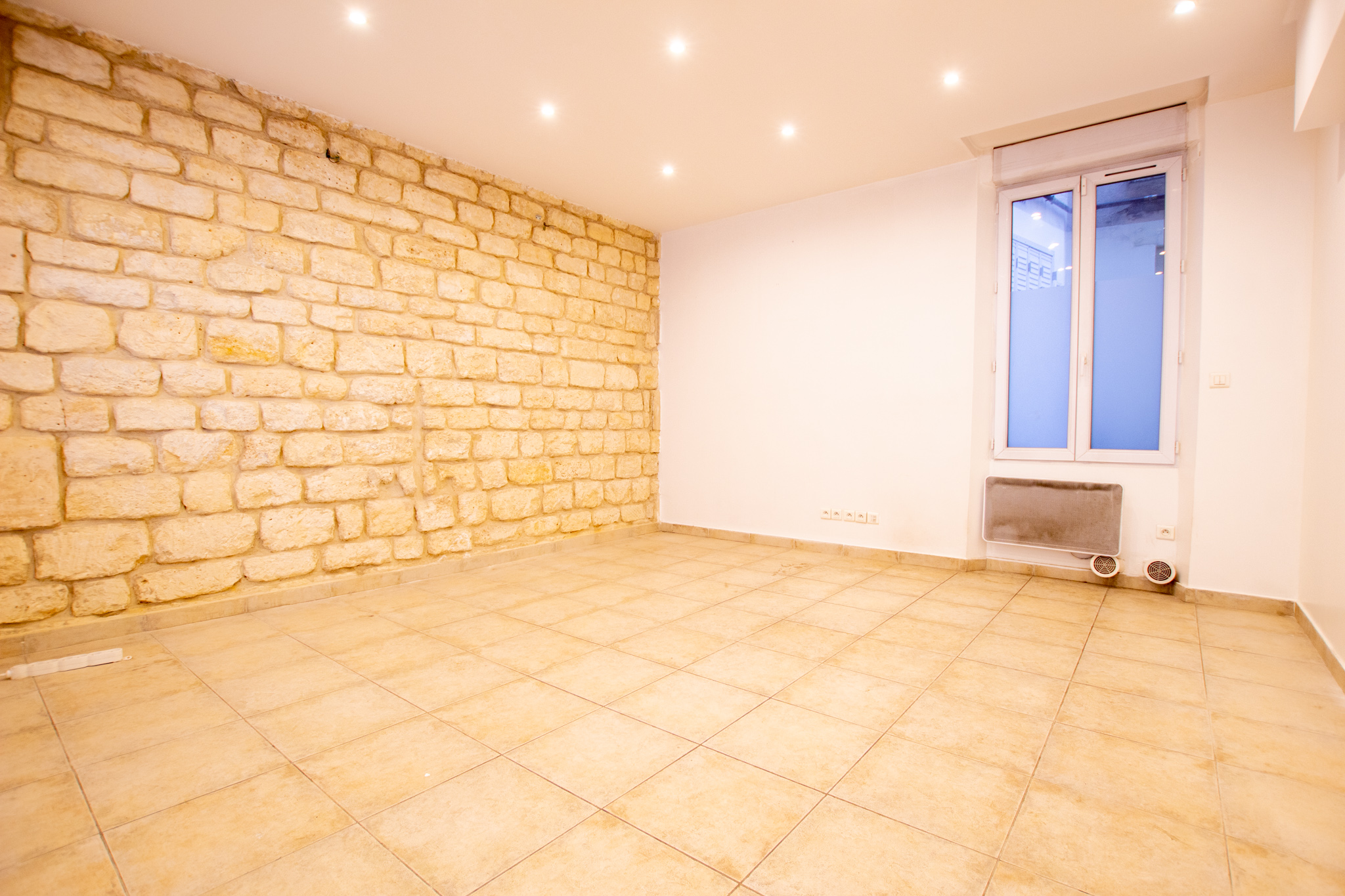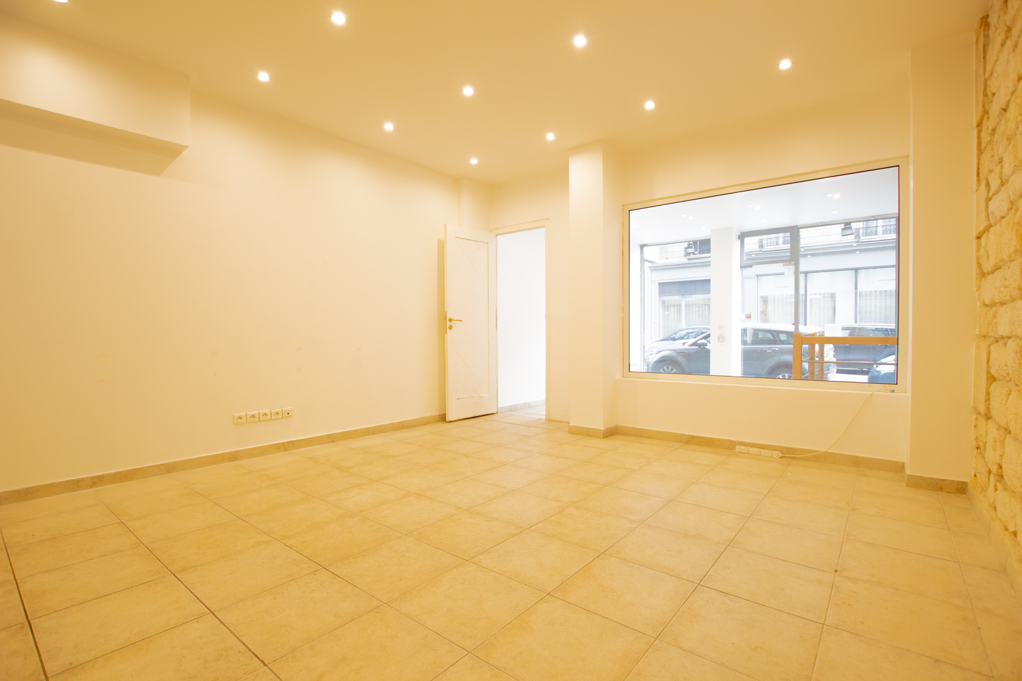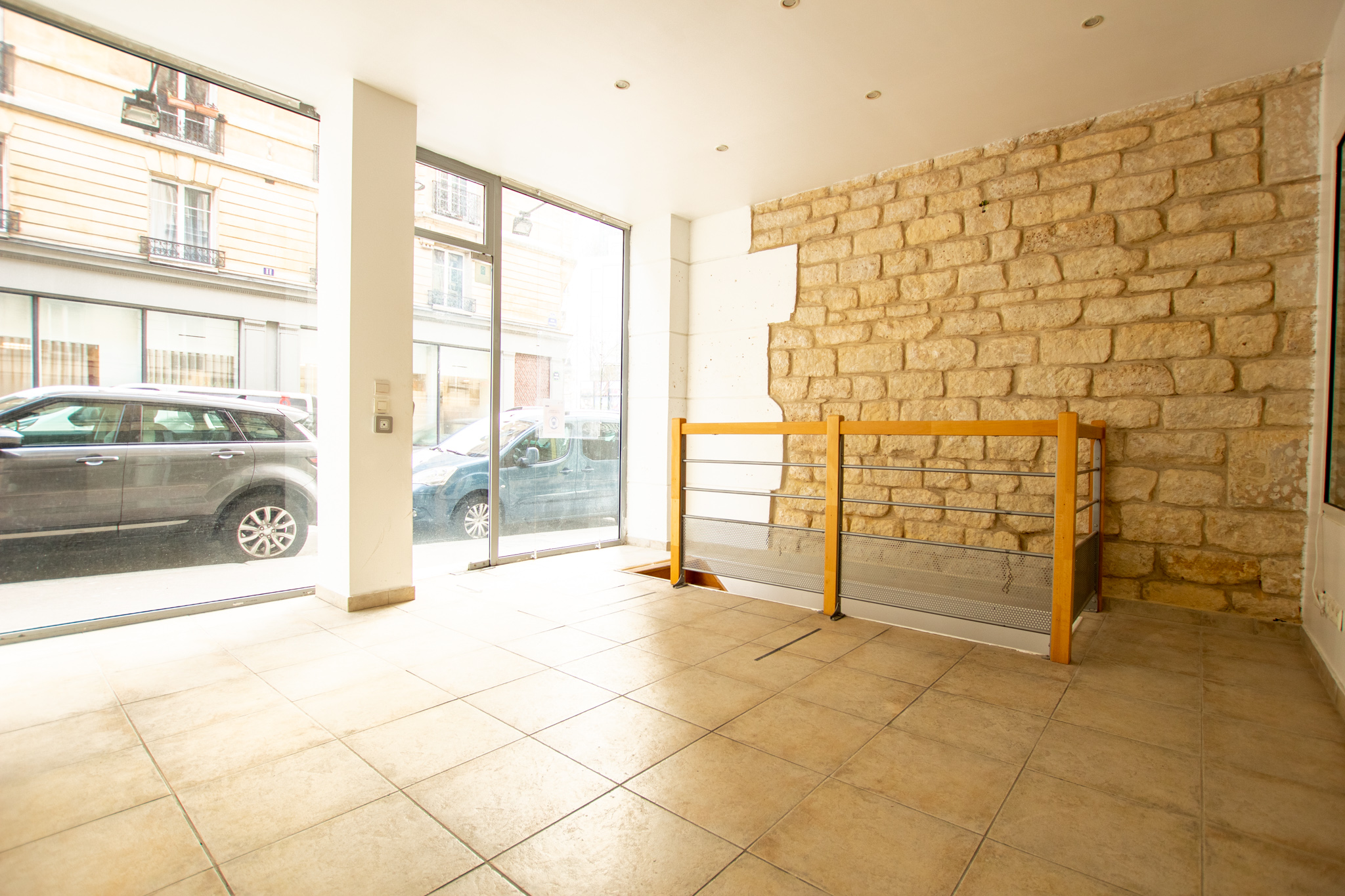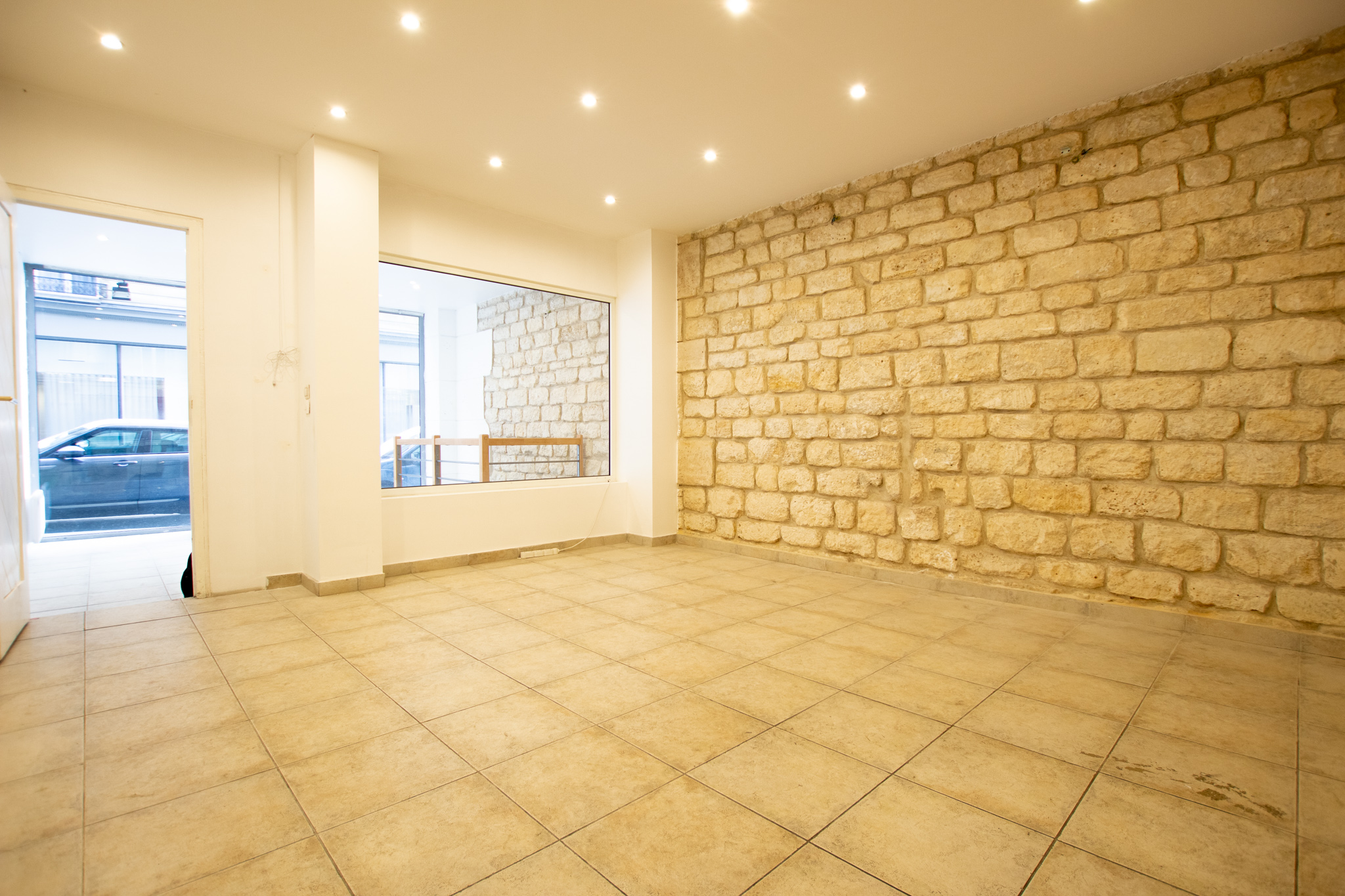 – au rez-de-chaussée :d’une première surface de vente lumineuse avec vitrine et d’une seconde pièce avec de belle pierre apparente sur les mur. Ces deux pièces sont séparés par une mur en partie vitré.