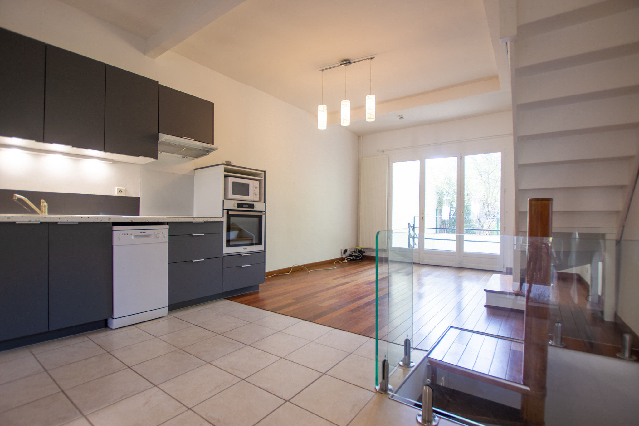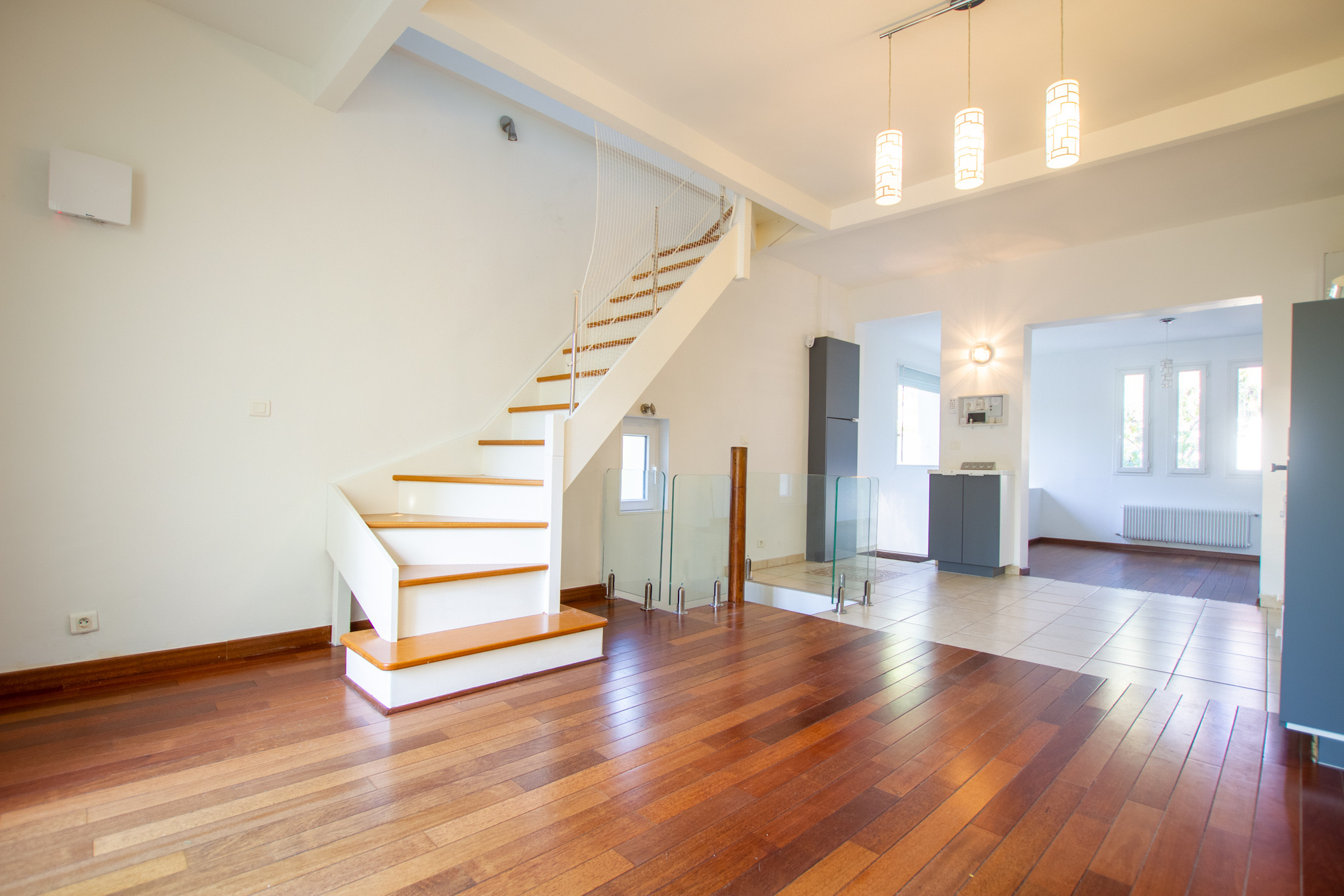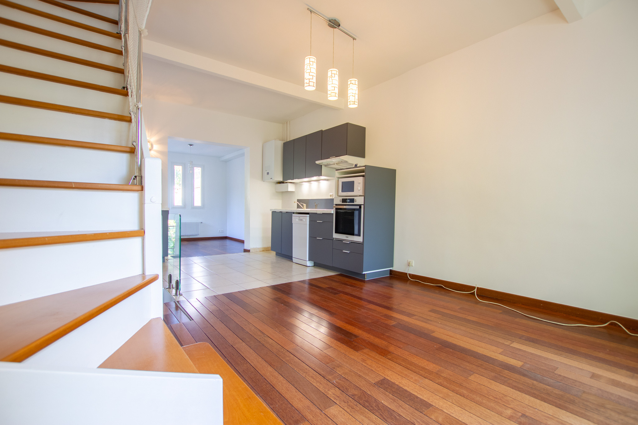 –  Au rez-de-chaussée un grand séjour avec cuisine américaine aménagée, une salle à manger.