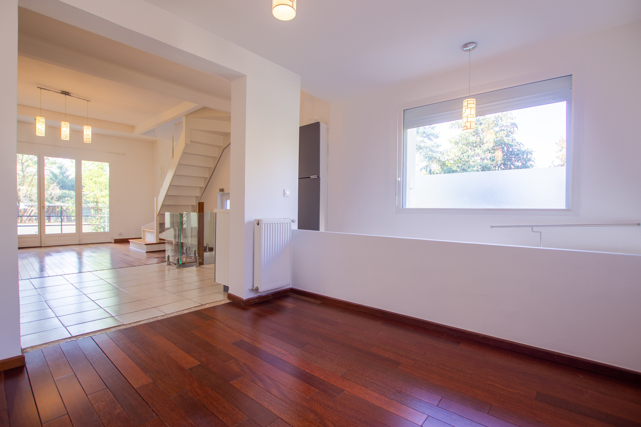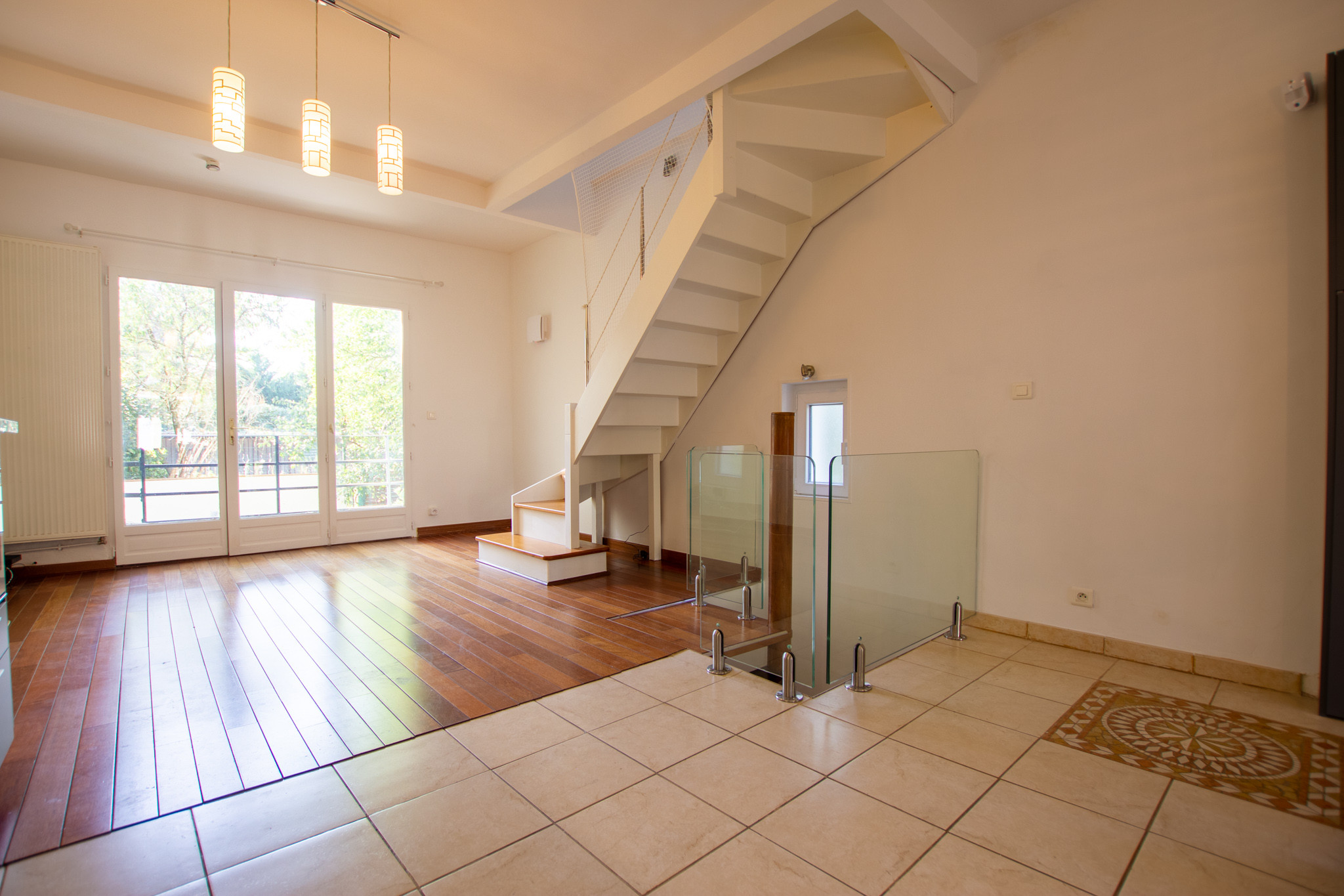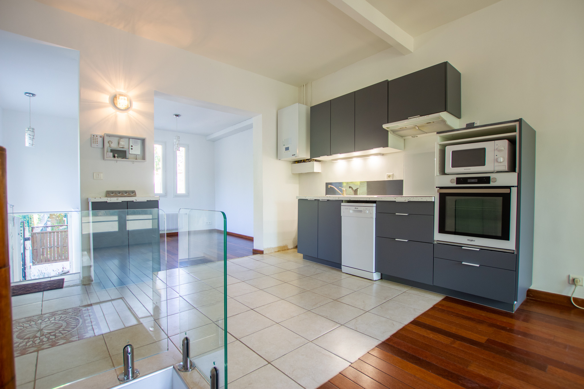 –  Au rez-de-chaussée un grand séjour avec cuisine américaine aménagée, une salle à manger.